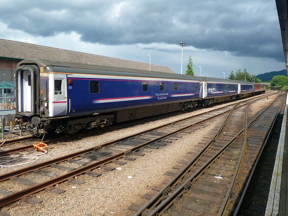 Caledonian Sleeper - UK Since April 2015, the night trains between London and Scotland are operated by Serco using brand name Caledonian Sleeper. GB Railfreight provides the locomotives for the night trains. The coaches for the night train are seen stabled at Fort William. Fort William, 05-07-2016 Digital photo by Marco van Uden |