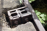 | GB_17_Day_6_Tain_buffer_detail. Another relic from the past at Tain station lies at the end of a long-disused and overgrown bay platform: a buffer stop formed entirely of old lengths of rail, fishplates and bolts. A very practical, 19th century re-use of redundant materials. 1st May 2025. roger.griffiths@hotmail.com |