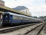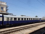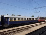 During September in Bulgaria there is a carry out an attraction trip of group hungarian tourists with retro style sleeping cars , restaurants , generator and salon car.The compositon includes carriages of type "Nostalgia" train and onto the destination plates there are an inscriptions "Golden Eagle Danube Express".On these pictures you can see some of different types of cars.