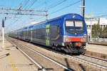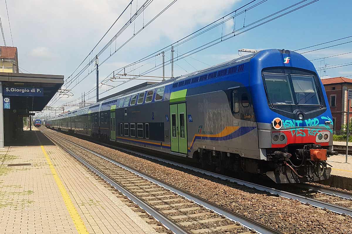 Not better identified Trenitalia Double deck Driving Trailer Vivalto npBH type id leading its consist pushed by a E.464 loco operating a Regionale Veloce (Regional Fast Service) from Venezia Santa Lucia to Bologna Centrale. The train just crossed a similar consist operating the same fast service in the other (Bologna to Venezia) direction. San Giorgio di Piano BO Station 17/07/2020.