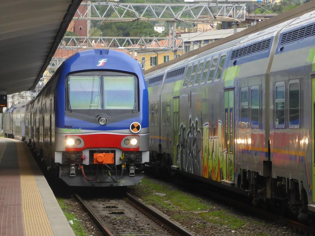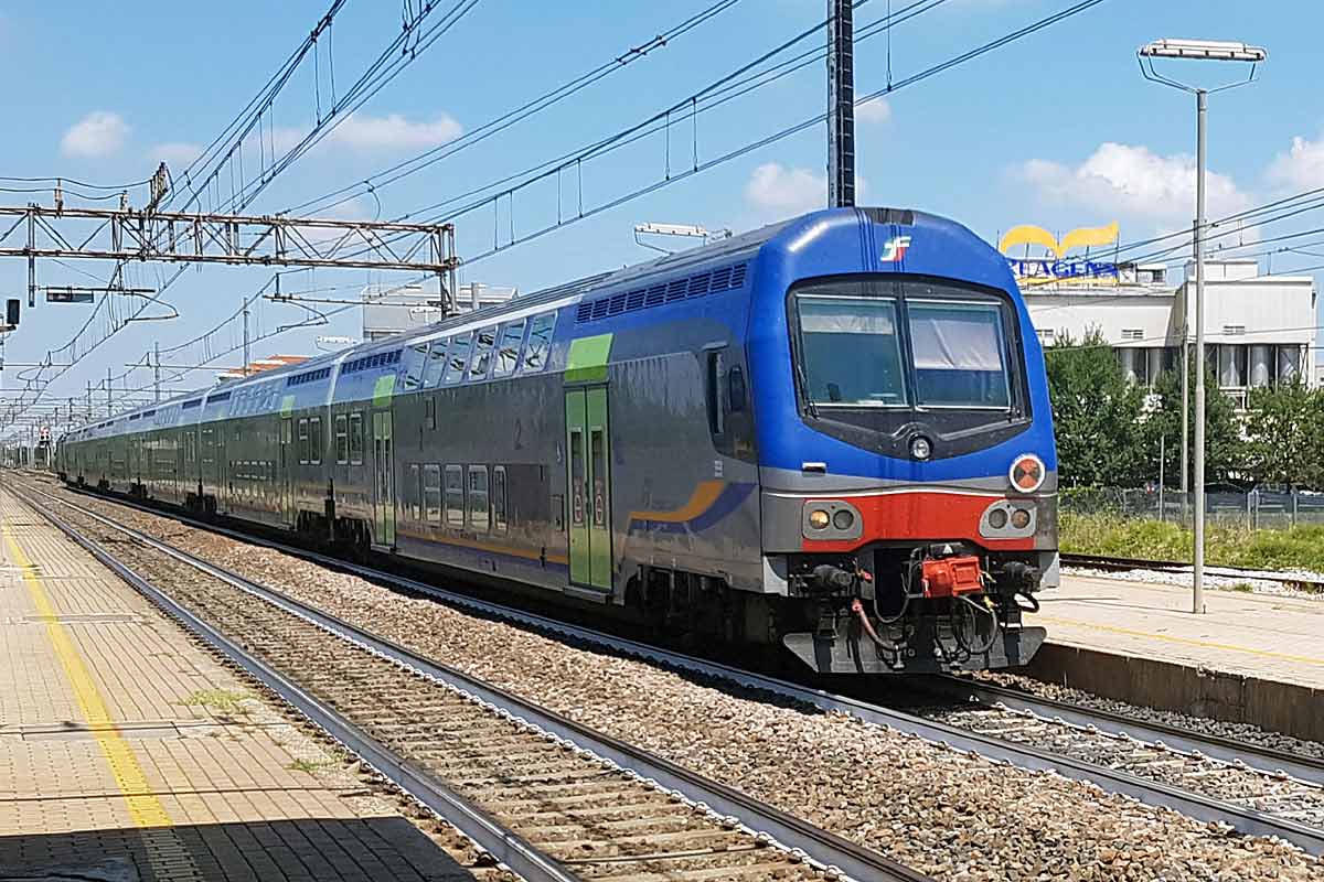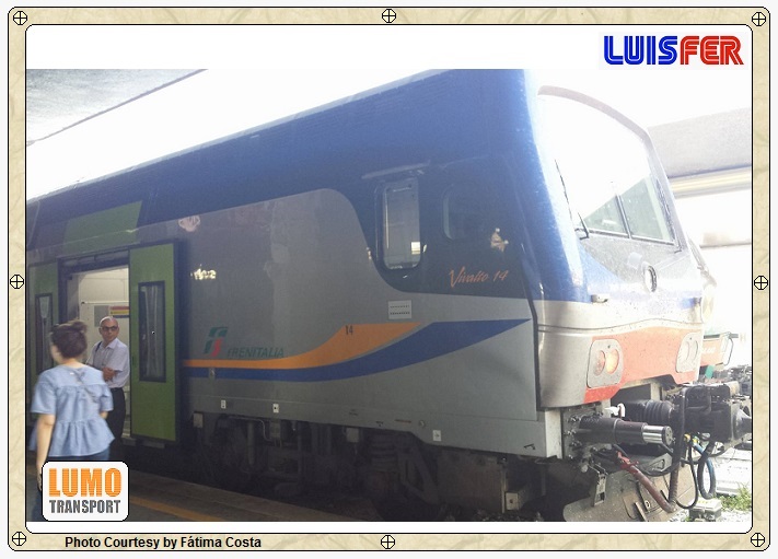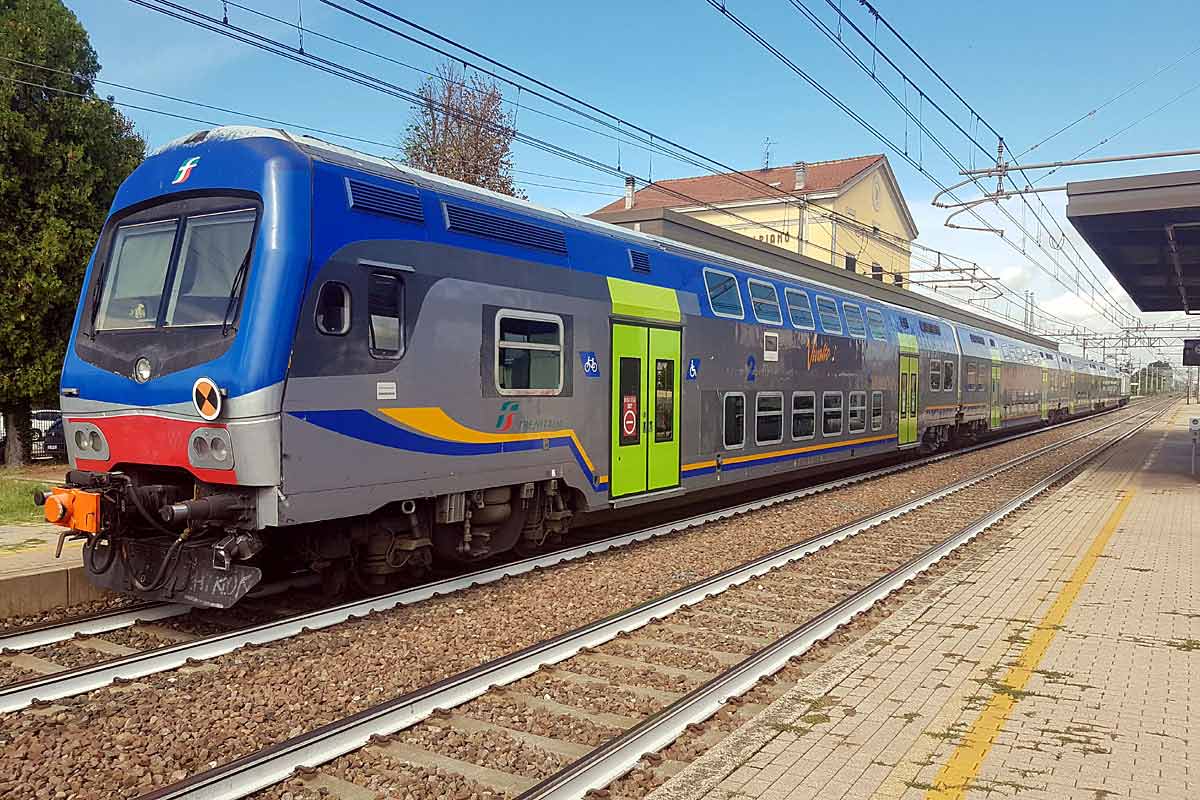 A double deck passenger car type "nB" of FS (Ferrovie dello Stato / Italian Railways) at railway station Venezia Santa Lucia in composition of RV 3447 to Trieste Centrale.