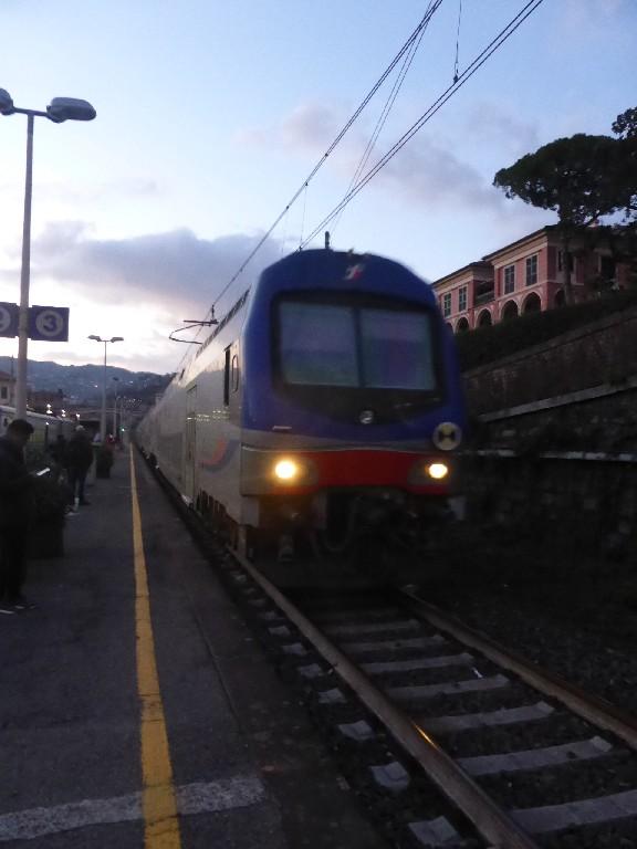A consist of Trenitalia / DPR Veneto Vivalto double deck coaches, with a not better identified VIvalto Driving Trailer at the rear of the train, stops in a foggy morning at Venezia Mestre station. 06/02/2024.
