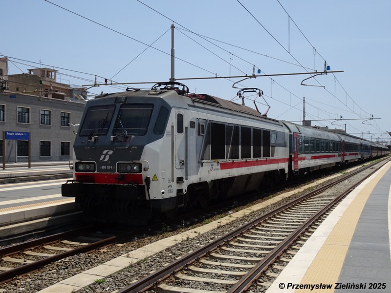 Trenitalia single cab electric loco E.401-024 (NVR 91 83 2401 024-1 I-TI), in the IC colors with grey stripe, at the rear of an iC consist that stops at Bologna Centrale Station 02/08/2025.