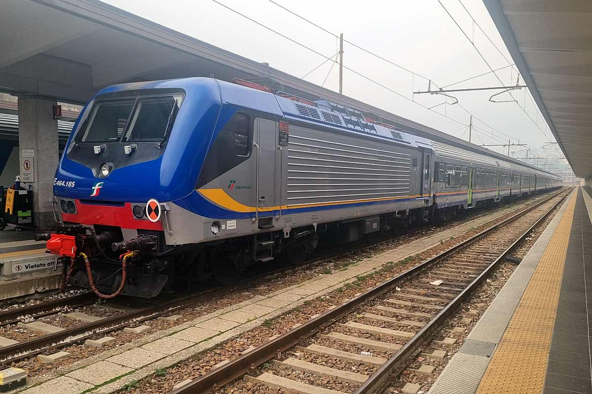 Trenitalia / DPR Friuli Venezia Giulia single cab electric loco E.464-185 (NVR nr. 91 83 2464 185-42 I-TI) with a consist of MDVC and MDVE coaches at Trieste Centrale station. 06/02/2024.