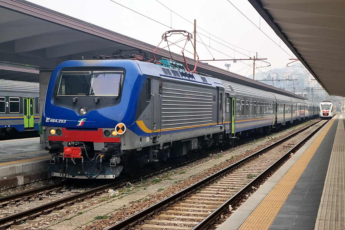 Trenitalia / DPR Friuli Venezia Giulia single cab electric loco E.464-253 (NVR nr. 91 83 2464 253-2 I-TI) with a consist of MDVC and MDVE coaches arrives at Trieste Centrale station. 06/02/2024.