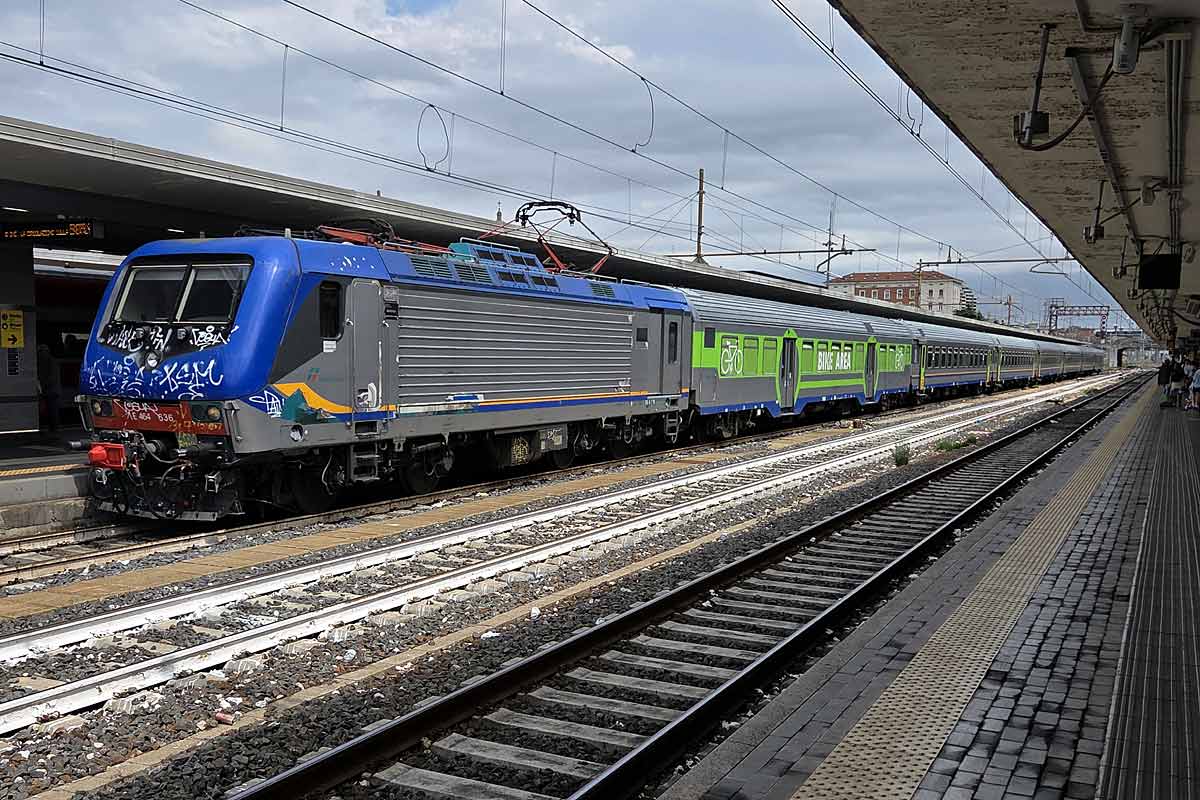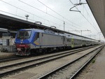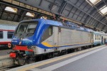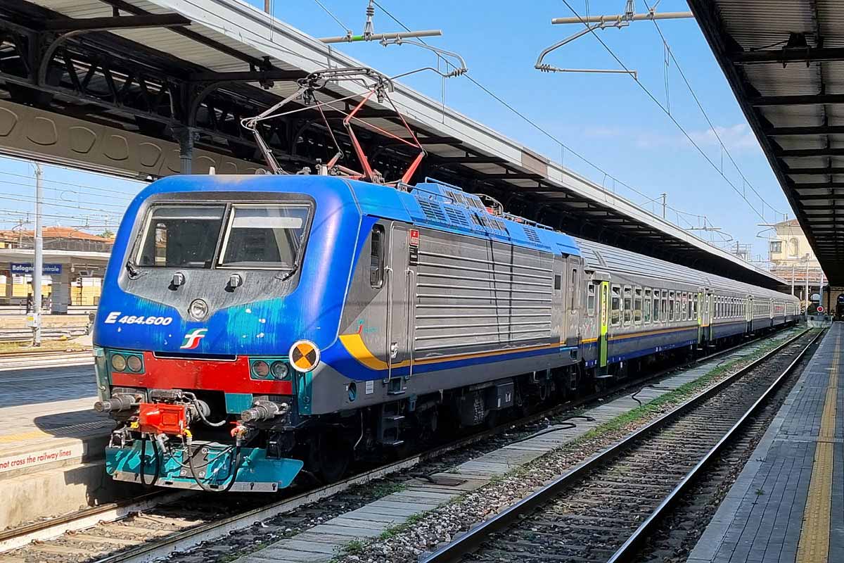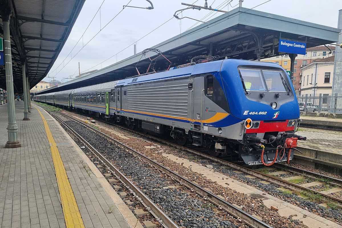 Trenitalia Single Cab electric loco E.464-636 (NVR 91 83 2464 636-6 I-TI) in the DPR color scheme, with only few graffiti on the front..., at Bologna Centrale station with its consist of MDVC & MDVE coaches ready to operate Fast Regio service to Brennero. 02/08/2025.