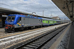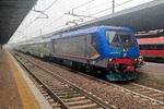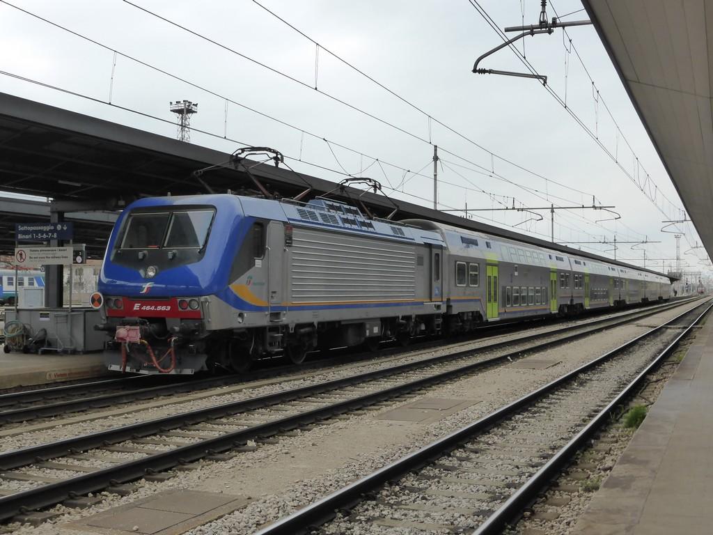 An electric locomotive of FS (Ferrovie dello Stato / Italian Railways) with number 464.562 of FS at railway station Venezia Santa Lucia with RV 3447 to Trieste Centrale.
