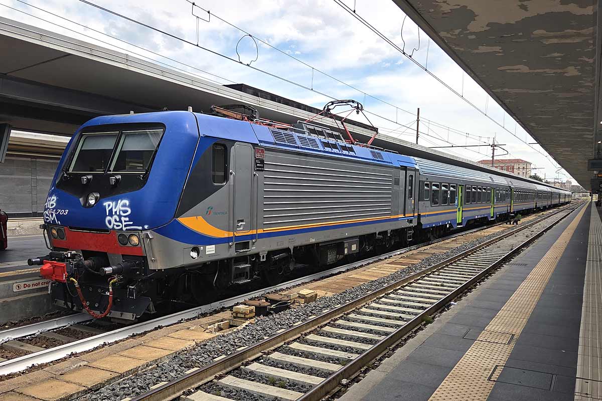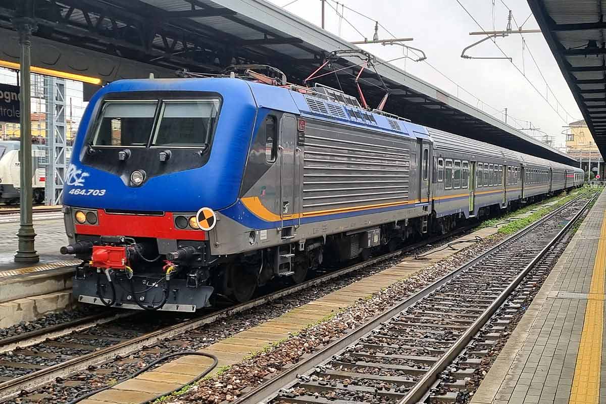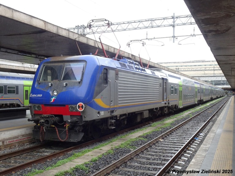 Trenitalia Single Cab electric loco E.464-703 (NVR 91 83 2464 703-4 I-TI) in the DPR color scheme, with only few graffiti on the front..., at Bologna Centrale station with its consist of MDVC & MDVE coaches ready to operate Fast Regio service to Brennero. 02/08/2025.