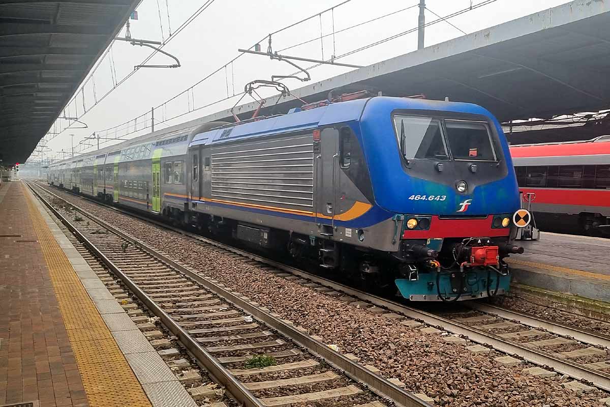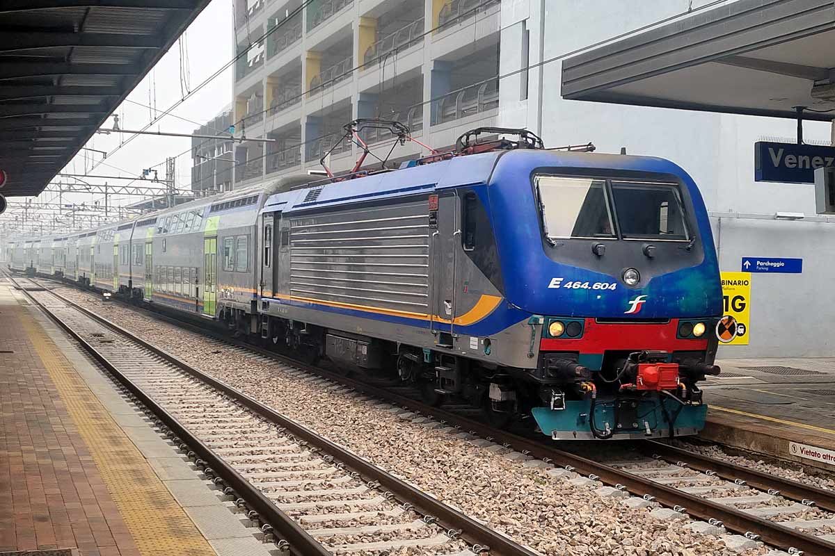 Trenitalia / DPR Veneto electric loco E.464-643 (NVR nr. 91 83 2464 643-2 I-TI) in DPR color scheme with a set of Vivalto double deck coaches at Venezia Mestre station. 06/02/2024.