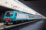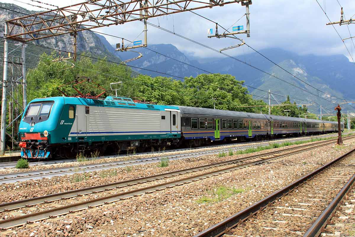 Trenitalia single cab loco E.464-557 (NVR 91 83 2464 557-4 I-TI) in clean old XMPR Colors heading a long consist of MDVC and MDVE coaches on a local service at Peri Station along the Brenner Line. 02/08/2023.