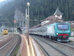Trenitalia single cab loco E.464-557 (NVR 91 83 2464 557-4 I-TI) in clean old XMPR Colors at Peri Station along the Brenner Line. 02/08/2023.