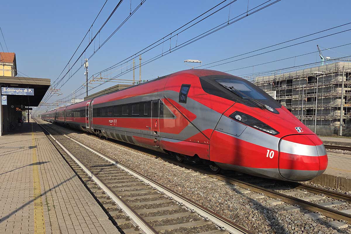 Trenitalia Frecciarossa EMU-8 ETR.400-02 in the latest color scheme running towards Bologna on track 2 at San Giorgio di Piano BO station. 12/09/2025.