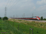 | In Fidenza-Bastelli an der Hochgeschwindigkeitsstrecke zwischen Mailand und Bologna rauscht ein ETR500 der FS als Zug Eurostar(ES9533) vorbei. Er fährt von Malpensa-Aeroporto über Milano-Bologna-Firenze-Roma nach Napoli. 2012-06-09 |
