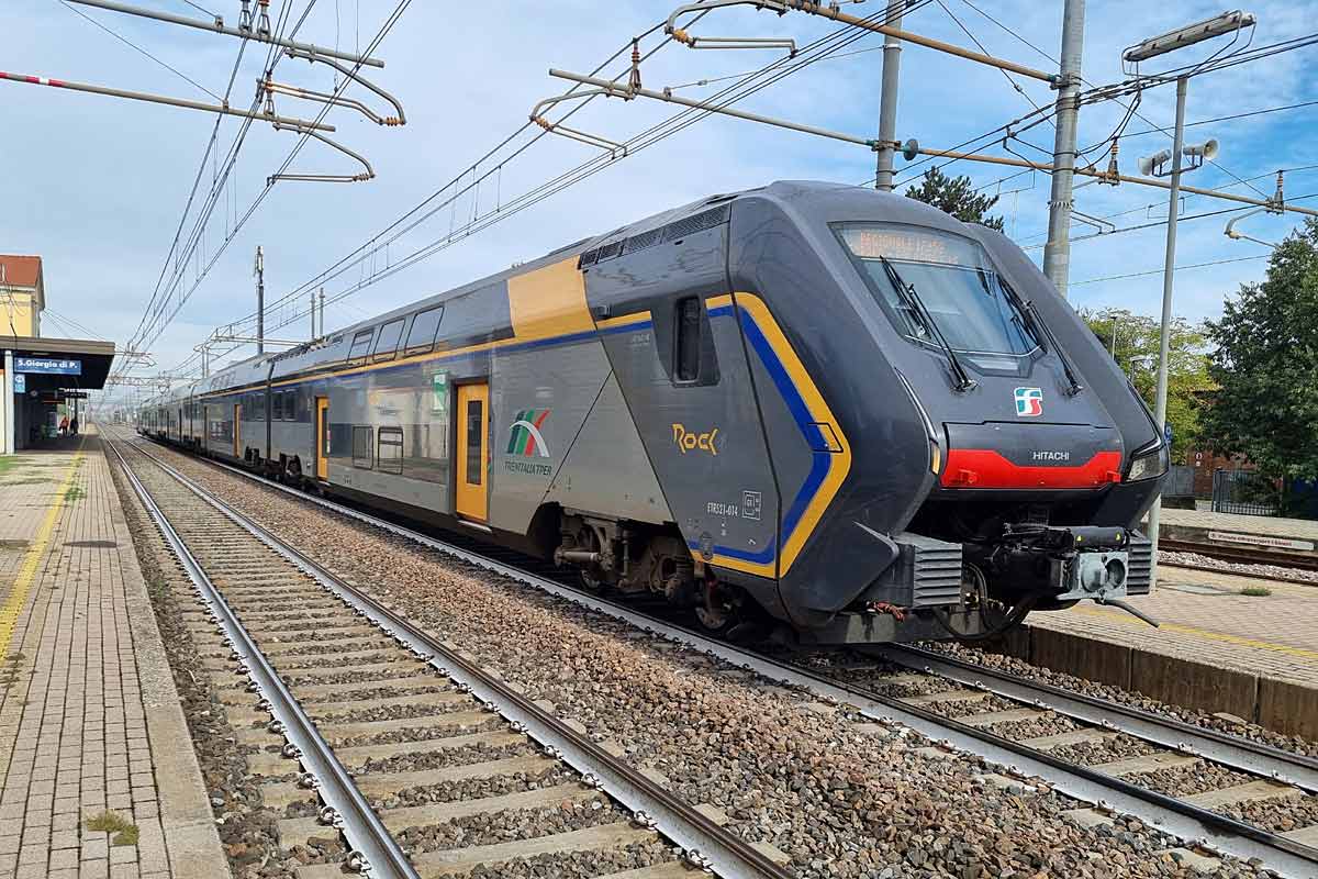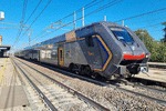 | Trenitalia (DPR Veneto) double deck EMU-5 ETR.521-155 running at full speed towards Venice on track 1 at San Giorgio di Piano BO station. The train is operating the hourly Inter Regio fast service Between bologna and Venice, service that most of the time is operated by a 6 unit EMU-6 ETR.621. 02/09/2025. Photo by Guido Allieri (guido@allieri.com) - www.allieri.com |