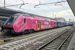Trenitalia/TPER (DPR Emilia Romagna) modern double deck EMU-5 ETR.521-008 in the special VIVA RICCIONE colors and operating a special Holiday service from Turin to the Adriatic Riviera (final stop Pesaro), is stopping at Bologna Centrale Station 02/08/2025. Here detail of the rear end coach in pink VIVA RICCIONE promotional colors.