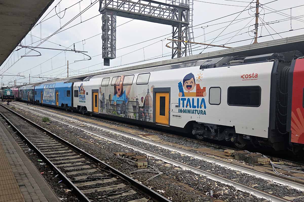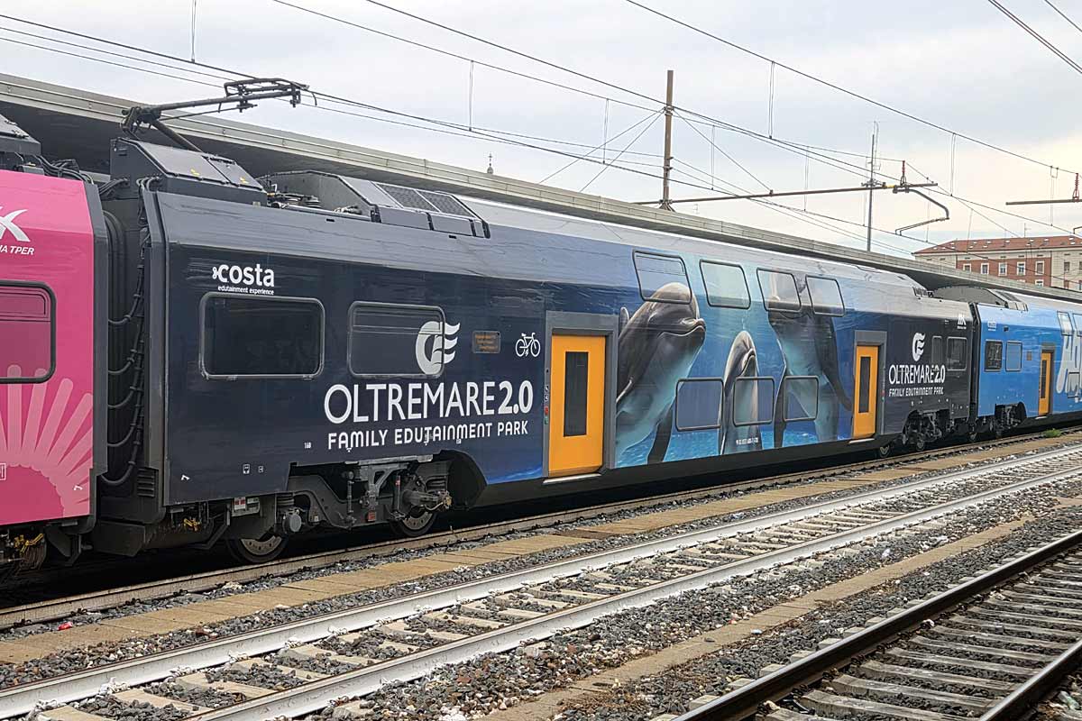 Trenitalia/TPER (DPR Emilia Romagna) modern double deck EMU-5 ETR.521-008 in the special VIVA RICCIONE colors and operating a special Holiday service from Turin to the Adriatic Riviera (final stop Pesaro), is stopping at Bologna Centrale Station 02/08/2025. Here detail of the intermediate coach in white ITALIA IN MINIATURA promotional colors.
