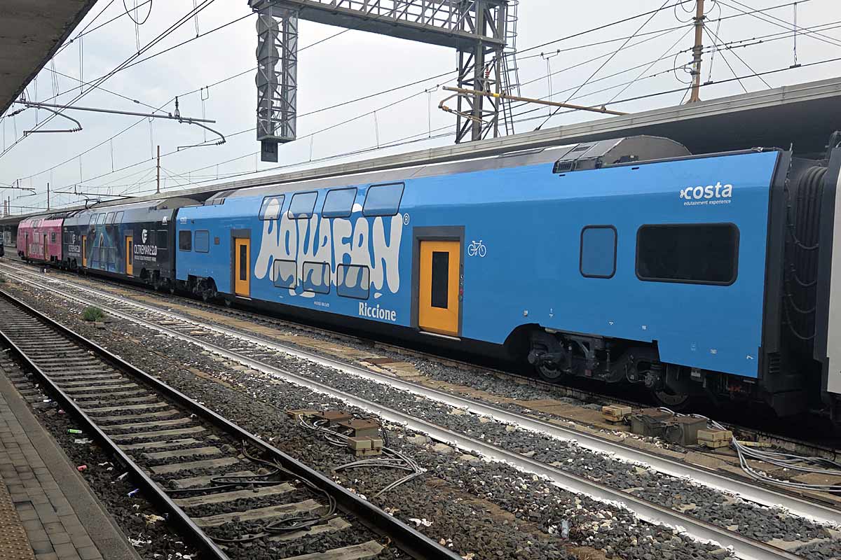 Trenitalia/TPER (DPR Emilia Romagna) modern double deck EMU-5 ETR.521-008 in the special VIVA RICCIONE colors and operating a special Holiday service from Turin to the Adriatic Riviera (final stop Pesaro), is stopping at Bologna Centrale Station 02/08/2025. Here detail of the intermediate coach NVR 94 83 0521 408-2 I-TTX in light blue ROLLAFAN RICCIONE promotional colors.