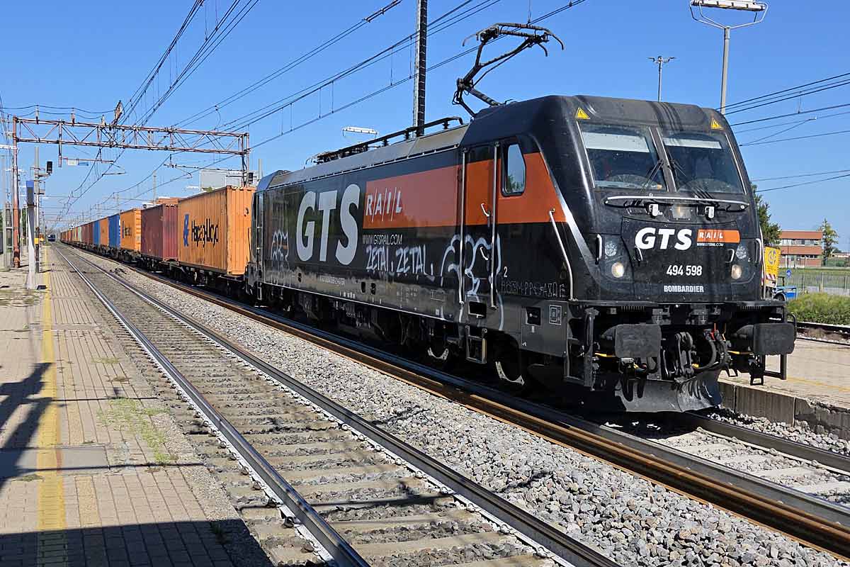 GTS Rail electric loco 494 598 (NVR 91 83 2494 598-2 I-GTSR) slows down its container train on track 3 at San Giorgio di Piano BO station. 07/07/2025.