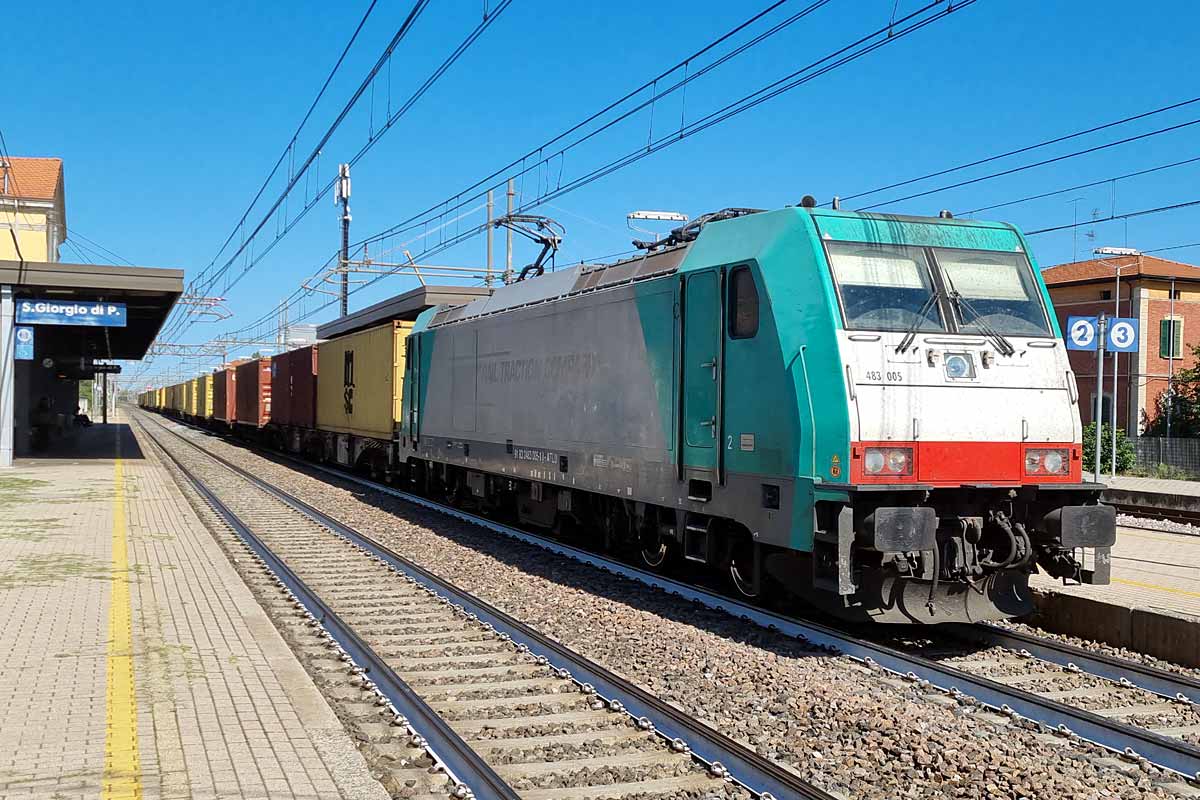 Running southbound on track 2 at San giorgio di Piano BO Station, Medway electric loco 483 0054 (NVR 91 83 2483 005-1 I-ATLU) shows no title but the previous RTC Rail Traction Company markings are still clearly visible after being removed. 06/08/2025.