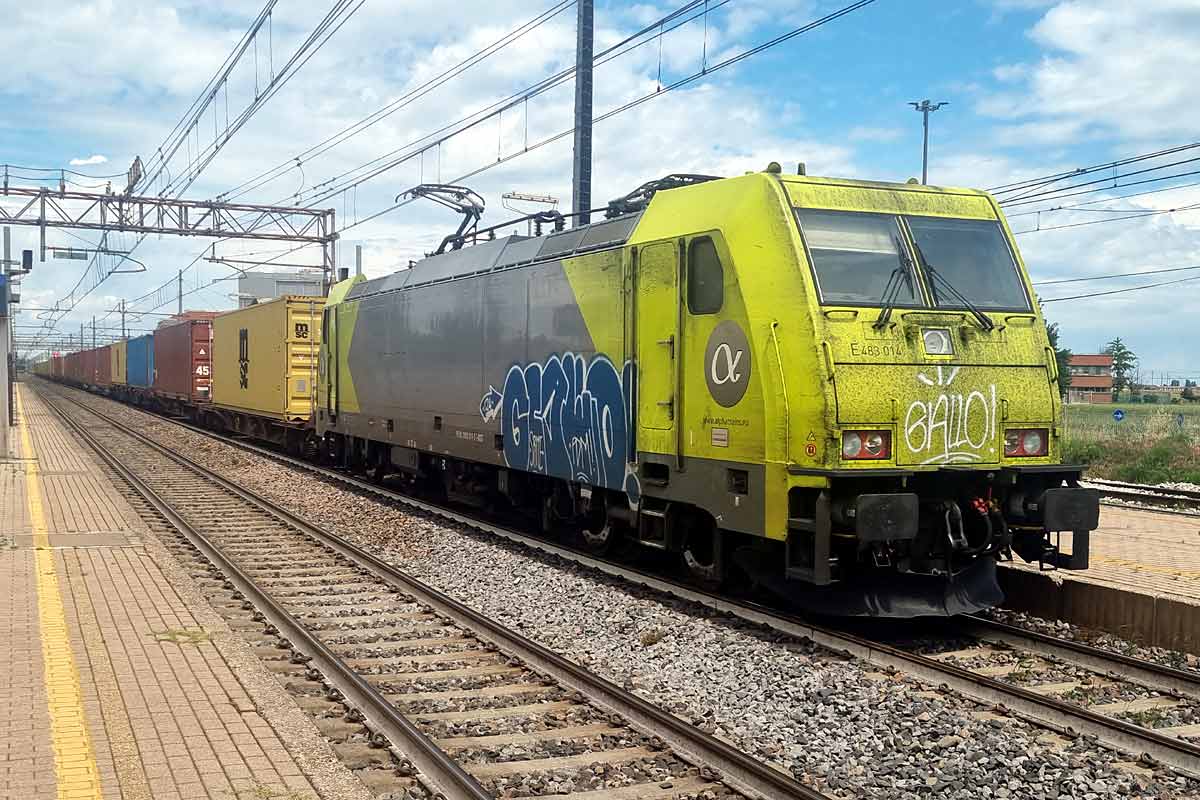 leased to Medway Italia, this heavily graffitted Alpha Trains eletric loco E 483 014 (NVR 91 83 2483 014-3 I-OCG) runnng southbound with a container train at San Giorgio di Piano BO station. 22/05/2024.