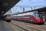 A 2 high speed EMUs "Italo" ETR 675 of NTV ("Nuovo Transporto Viaggiatori") at railway station Napoli Centrale, using a passenger trains.