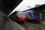 A view from 2 high speed EMUs - ETR 1000 of FS (Ferrovie dello Stato / Italian Railways) and Italo ETR 675 of NTV (Nuovo Transporto Viaggiatori) at railway station Napoli Centrale, using a high speed trains.