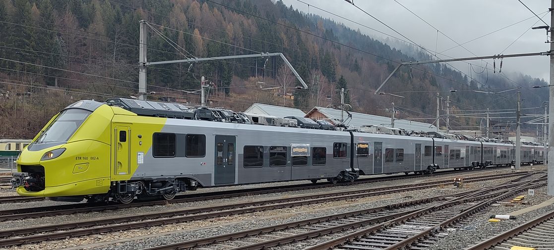 | ETR 160 002-A/B in Mürzzuschlag, with some cables taped to the outside and going into windows, indicating the unit is here for test runs probably on the Semmering line. The six-car unit consists of carbodies numbered 94 83 4160 021-1, 022-7, 023-2, 024-3, 025-0 and 026-0 of I-SAD. This is one of 15 units ordered by SAD/STA, with 8 more of the same type to be delivered to ÖBB (class 4160 would fit into the Austrian system). The units have 381 seats, a power of 3000 kW, reach a speed of up to 160 km/h and are capable of running in Austria and Italy, with one Austrian and two Italian pantographs on the roof. They will operate trains between Innsbruck, Lienz, Bolzano/Bozen, Merano/Meran and Malles Venosta/Mals starting december 2026. |