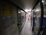 An interior in a second class passenger car of class 74 type "Bm" at railway station Iskar in composition of night fast train with number 8657 from Sofia to Varna via Plovdiv.