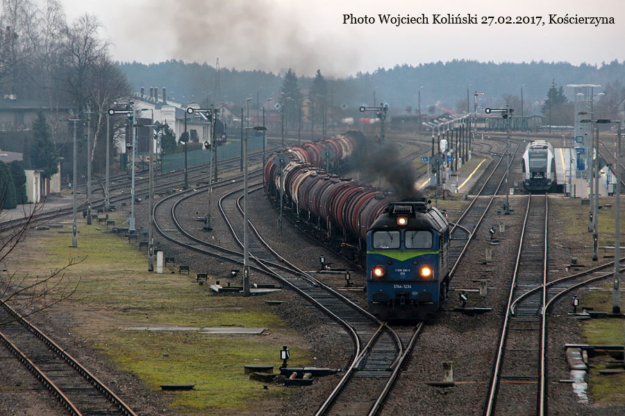 PKP Cargo ST44-1234 with the freight train Gdynia Port - Lipusz (SM42-1289 at the end) 27.02.2017, Koscierzyna Photo W. Kolins |
