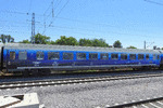 A second class Intercity passenger car of class 97, type "Bpmz" at central railway station Plovdiv in composition of test train.