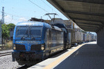 A private electric locomotive SIEMENS Smartron with number 91 52 10 80 007 - 3 , owned by private operator "PIMK Rail" at railway station Pazardjik with freight train.