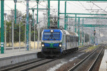 A private electric locomotive SIEMENS Smartron with number 91 52 10 80 064 - 4 , owned by private operator "LTE" at railway station Tulovo before pulling a freight train.