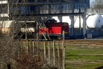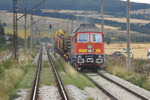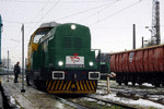 A private diesel locomotive with number 92 52 00 07 367 - 2 , owned by TCR ("Transport Construction and Rehabilitation") near railway station Ihtiman with work train.