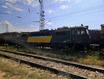 A private electric locomotive with number 91 52 00 87 003 - 7, owned by private operator BRC ("Bulgarian Railway Company") at railway station Iliyantsi, after pulling a freight train.