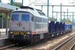 A private eletric locomotive with number 91 52 00 46 757 - 8, owned by "Express Service", standing at railway station Dimitrovgrad central with freight train.