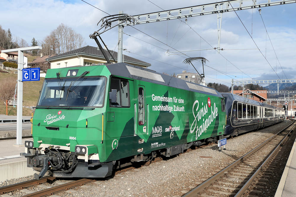 MOB - Switzerland MOB locmotive Ge 4/4 nr. 8004 in advertising livery with a GoldenPass Express variable gauge coach set, originating from Montreux and on its way to Interlaken. Montbovon, 02-01-2026 Photo by Marco van Uden |