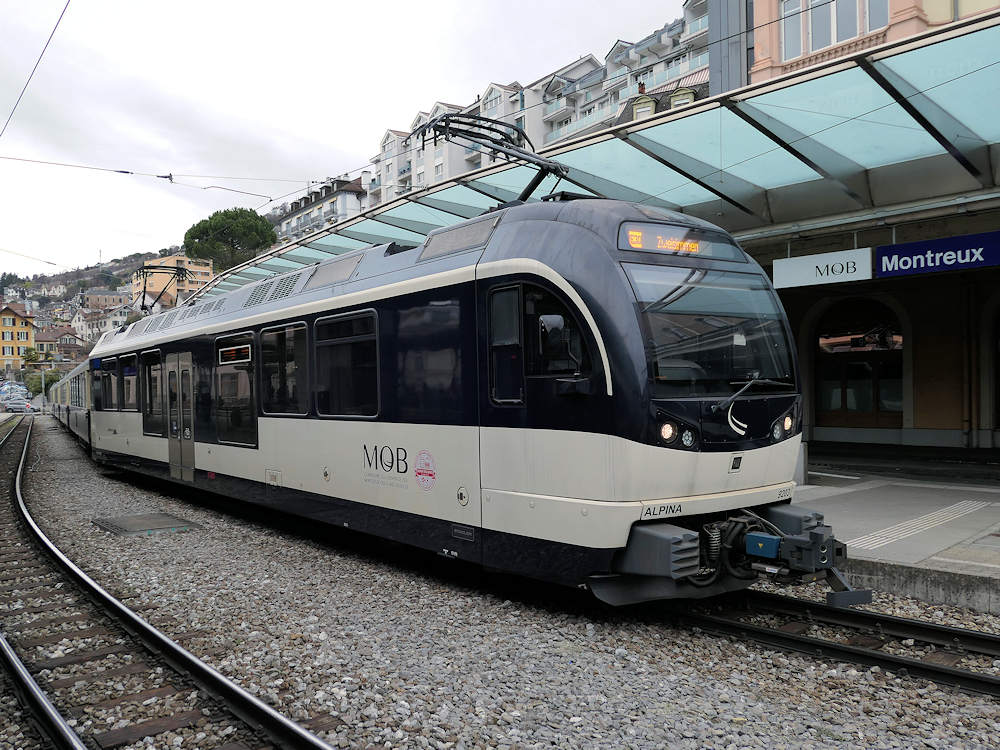 MOB - Switzerland Modern Stadler motor car Be 4/4 nr. 9203 at the other end of the Belle Epoque historic set of coaches. Montreux, 02-01-2026 Photo by Marco van Uden |