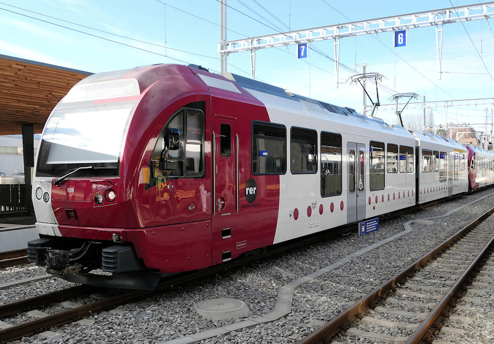 TPF - Switzerland Narrow gauge trainset ABe 4/8 number 109 (without a second class center car) is seen stabled at Bulle. This type of trainsets built by Stadler is now very common on Western Swiss narrow gauge lines. Bulle, 02-01-2026 Photo by Marco van Uden |