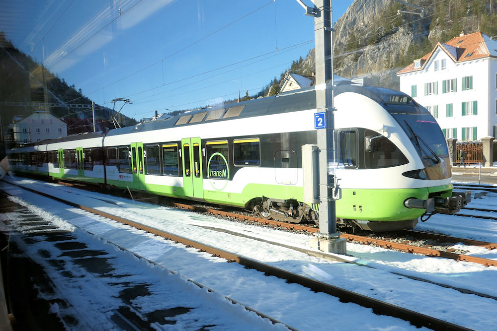 transN - Switzerland Electric "FLIRT" trainset RABe 523 075 is seen stabled at Fleurier. This class of trainsets (very similar to SBB class RABe 523) is used on the Neuchâtel-Buttes line. Fleurier, 03-01-2026 Photo by Marco van Uden |