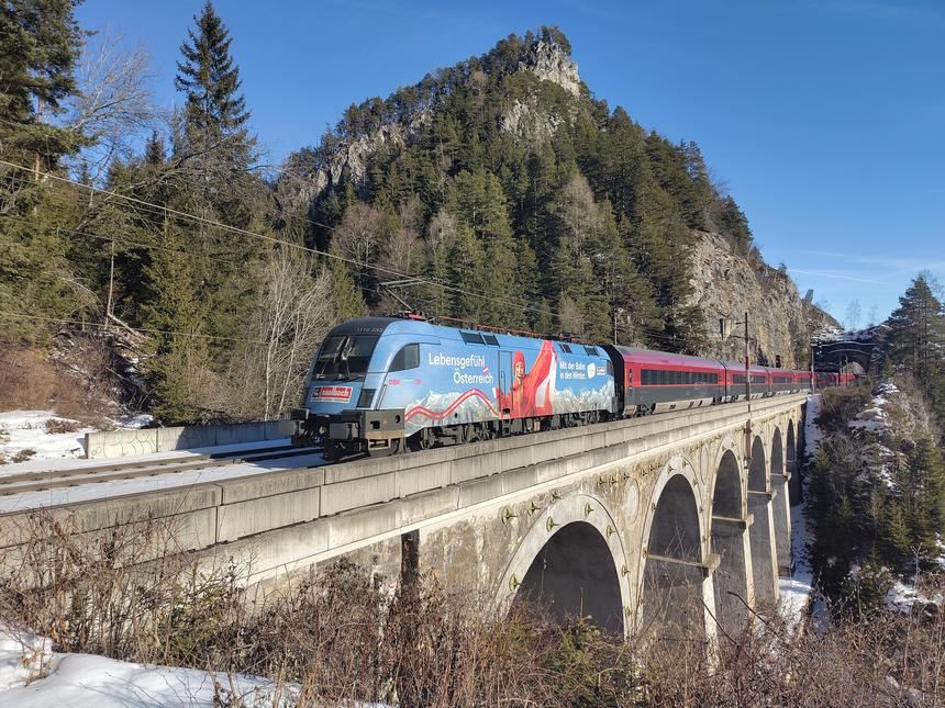 | A-ÖBB 91 81 1116 233-8 (Saalbach advertisement) pushing a railjet, crossing the Krauselklauseviadukt near Breitenstein. 2026-01-14. |