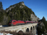 | A-ÖBB 91 81 1116 156-1 pulling an intercity train, crossing the Krauselklauseviadukt near Breitenstein. 2026-01-14. |
