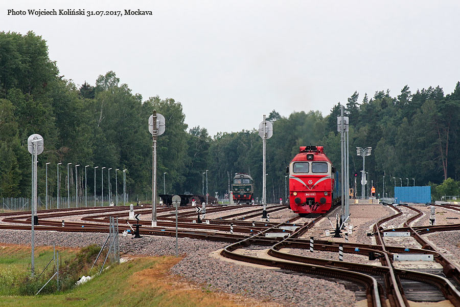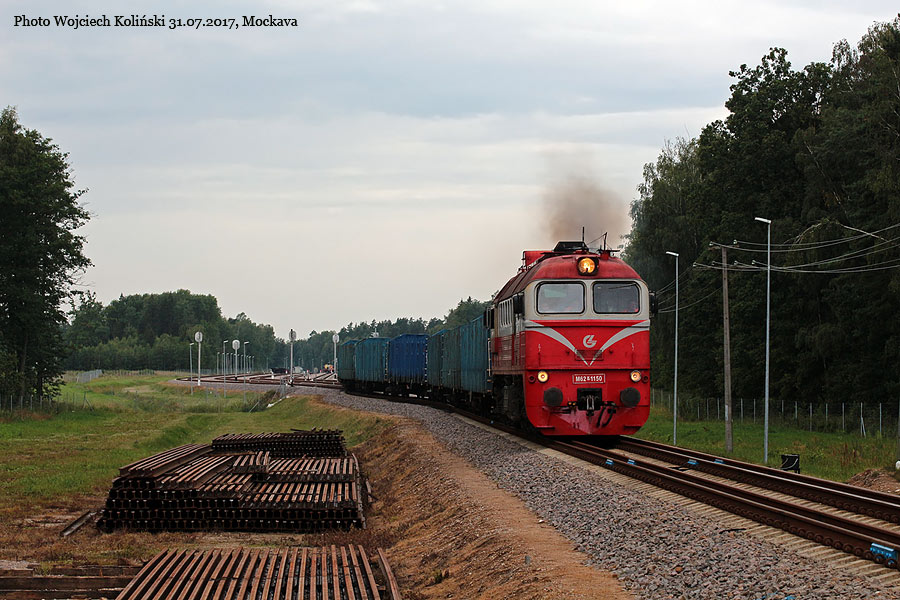 Lietuvos Gelezinkeliai (LG) M62K-1150 with the freight train to Sestokai (and ST44-1103) 31.07.2017, Mockava Photo W. Kolins |