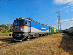 A private electric locomotive with number 91 52 00 85 608 - 5, owned by private operator "Rail Net Cargo" at railway station Pazardjik with freight train.