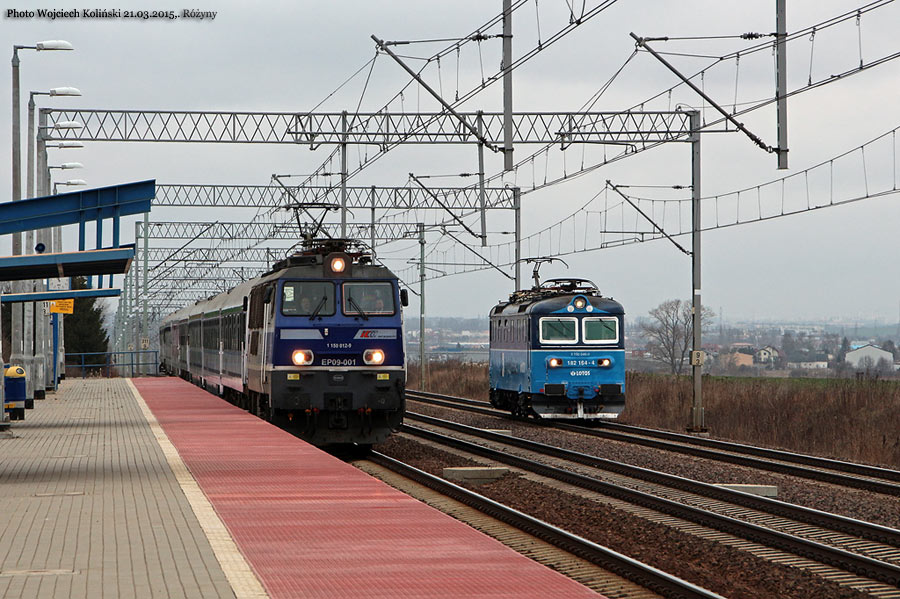 PKP Intercity EP09-001 with the passenger train "Norwid" Gdynia Glowna - Krakow Glowny and 182 164-4 21.03.2015, Rozyny Photo W. Kolins |