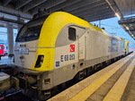 An electric locomotive E 68 017 of TCDD ( Turkiye Cumhuriyeti Devlet Demiryollari / Turkish Railways ) standing at railway staion Istanbul HalkalI with International train with number 492 to Sofia.
