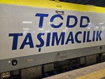 A logo of TCDD onto electric locomotive E68 of TCDD ( Turkiye Cumhuriyeti Devlet Demiryollari / Turkish Railways ) at railway station Istanbul HalkalI after pulling a passenger train.