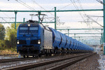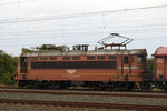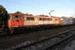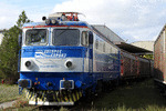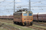 A private electric locomotive with number 91 52 00 46 111 - 8, owned by private operator BRC ("Bulgarian Railway Company") at railway station Iliyantsi, after pulling a freight train.