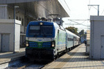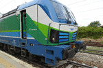 A private electric locomotive SIEMENS Smartron with number 91 52 10 80 004 - 0 , owned by private operator "PIMK Rail" at railway station Nova Zagora with freight train.
