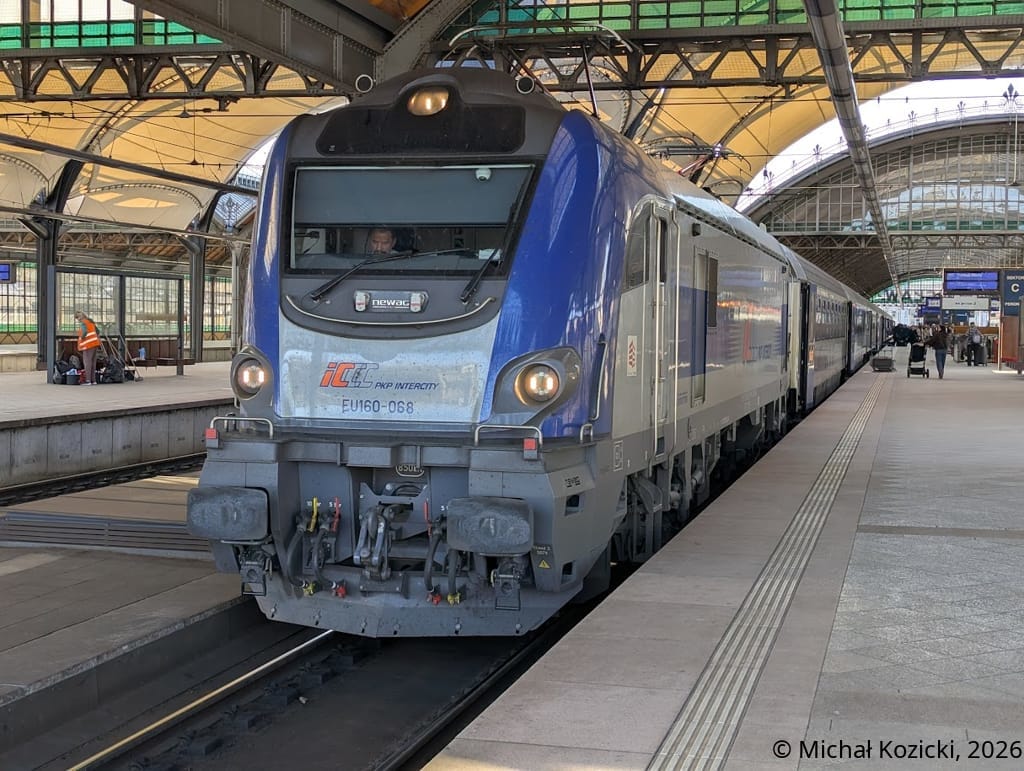 PKP IC EU160-068 makes a stop at Wroclaw Gl. on the IC "Kossak" service from Kolobrzeg to Przemysl, Poland, 07.03.2026.