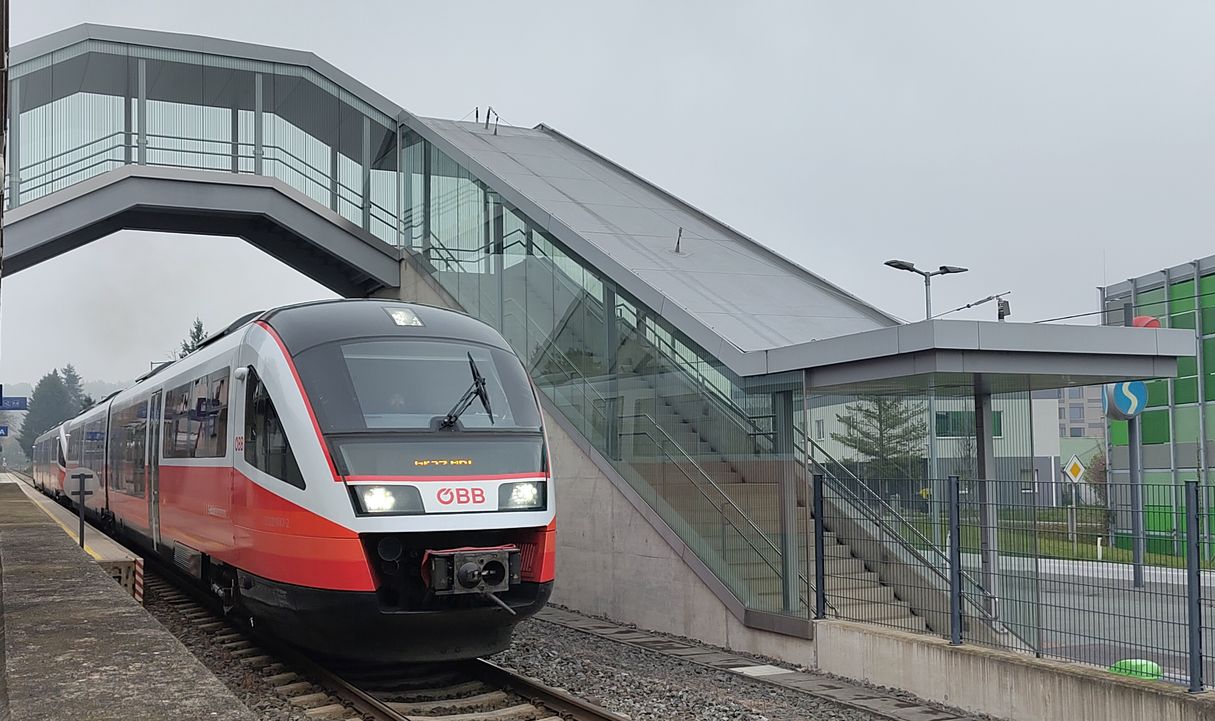 | Hart bei Graz, a stop on the single-track line from Graz to Szentgotthárd, regularly served by line S3. The pedestrian overpass has already been adjusted for the future installation of overhead wires. 2026-04-11. |